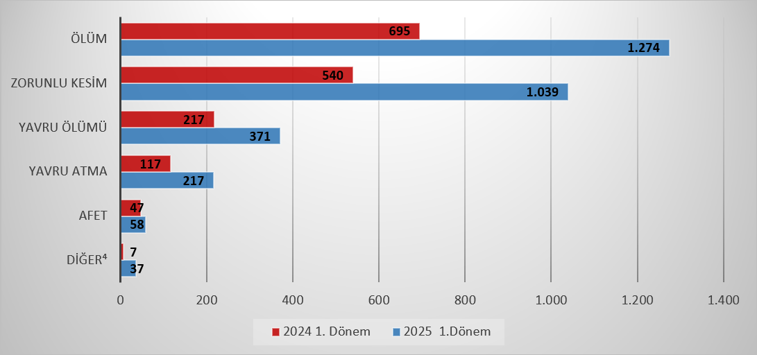 2025 yılının I. döneminde hayvansal üretim branşlarında üreticilerimize 2.996.040.805 TL hasar ödemesi yapılmıştır. Üreticilerimize ödenen hasar nedenleri içerisinde; 1. sırada %42,5’lik oranla “Ölüm”, 2. sırada %34,7’lik oranla “Zorunlu Kesim” ve 3.sırada %12,4’lük oranla “Yavru Ölümü” gelmektedir. Hayvan ölümü için 2024 yılının I. döneminde 695 milyon TL hasar bedeli ödenmiş olup, 2025 yılının aynı döneminde ödenen hasar bedeli 1.274 milyon TL olarak gerçekleşmiştir.