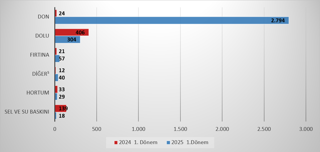 2025 yılının I. döneminde bitkisel üretim branşlarında üreticilerimize 3.243.346.021 TL hasar ödemesi yapılmıştır. Üreticilerimize ödenen hasar nedenleri içerisinde; 1. sırada %86,2’lik oranla “Don”, 2. sırada %9,4’lük oranla “Dolu” ve 3. sırada %1,8’lik oranla “Fırtına” gelmektedir. Don zararı için 2024 yılının I. döneminde 24 milyon TL hasar bedeli ödenmiş olup, 2025 yılının aynı döneminde ödenen hasar bedeli 2.794 milyon TL olarak gerçekleşmiştir.