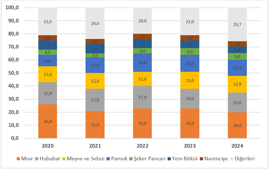 2024 yılında sulama alanlarında mısır %20, hububat %15, meyve-sebze %12,9 ve pamuk %12,4 paya sahip olmuştur.