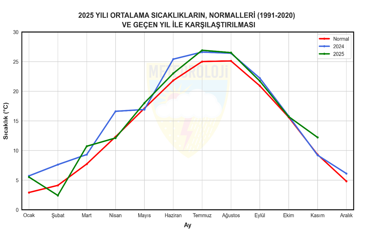 2025 yılı Kasım ayında ortalama sıcaklıklar, Akhisar, Gediz, Dalaman, Göksun, Acıpayam, Korkuteli, Sivas, Zara, Kangal, Kızılcahamam, Erzincan, Erzurum, Iğdır, Tunceli, Malatya, Bingöl, Muş, Hakkari, Horasan, Tercan, Divriği, Hınıs, Arapgir, Karakoçan, Solhan, Malazgirt, Palu, Baskil, Elbistan, Doğanşehir, Yüksekova, Batman, Ceylanpınar çevrelerinde mevsim normalleri civarında gerçekleşirken; yurdumuzun diğer bölgelerinde mevsim normallerinin üzerinde gerçekleşmiştir.