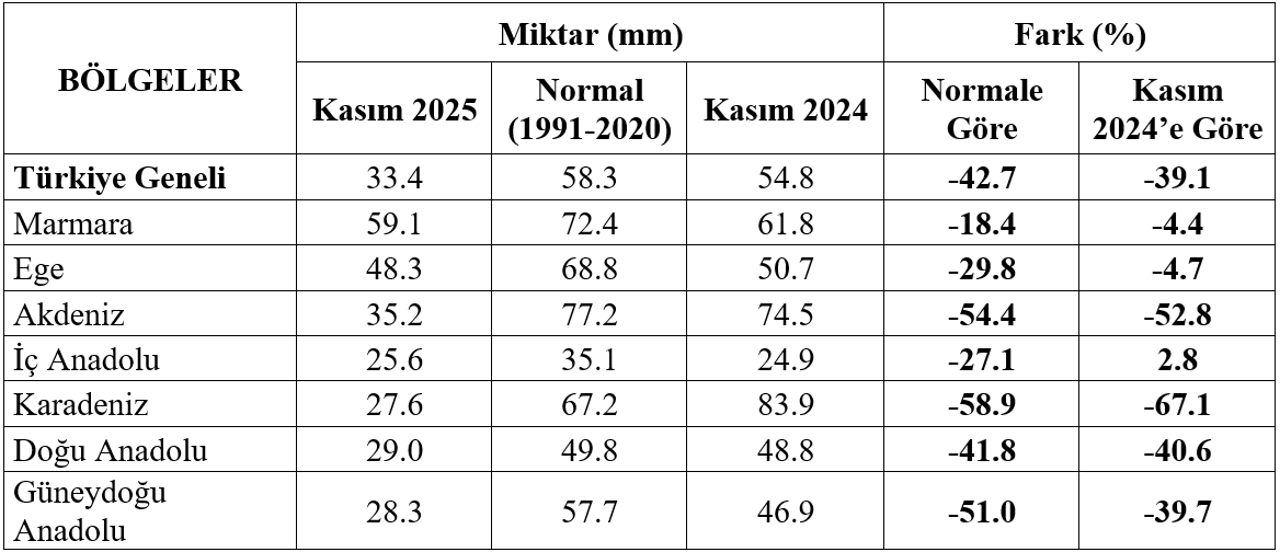 Türkiye genelinde Kasım ayında ortalama 33.4 mm yağış kaydedilmiştir. Kasım ayı normali 58.3 mm (1991-2020) ve geçen yıl Kasım ayı yağışı 54.8 mm’dir. Kasım ayı yağışı normalinin %43, geçen yıl Kasım ayı yağışının %39 altında gerçekleşmiştir. Yağışlar; Çanakkale’nin güneyi, Balıkesir’in batı kesimleri ile Sivas çevrelerinde %40’tan fazla artma gösterirken, Doğu Karadeniz, Doğu Anadolu’nun kuzeydoğusu ile Osmaniye, Gaziantep ve Kilis çevrelerinde %80’den fazla azalmıştır.