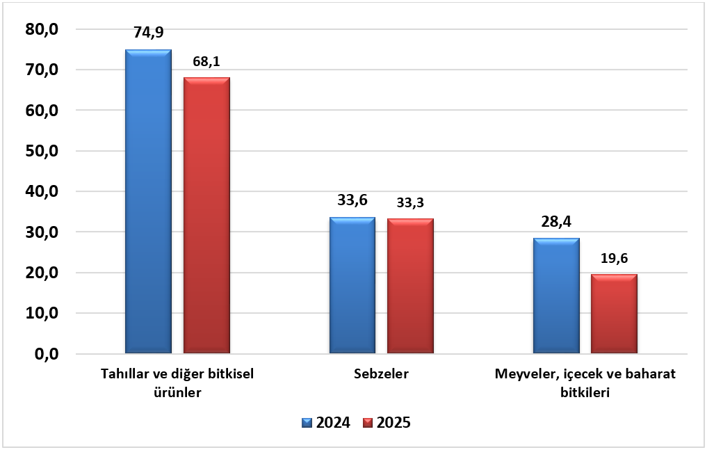 Tahıllar ve diğer bitkisel ürünler grubunda üretim %9 oranında düşerek 68,1 milyon tona gerilerken, tahıllar alt grubunda üretim %12,3 azalış gösterdi. Buğday üretimi %13,7 düşüşle 17 milyon 950 bin ton, arpa üretimi %25,9 oranında azalarak 6,0 milyon ton olarak gerçekleşti. Kırmızı mercimek üretiminde %38,3, yeşil mercimekte ise %58,1 oranında düşüşler yaşandı. Mısır üretimi %4,9 artarak 8,5 milyon tona yükseldi.
