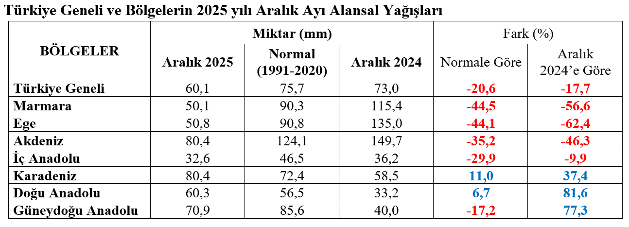 Türkiye genelinde Aralık ayında ortalama 60,1 mm yağış kaydedilmiştir. Aralık ayı normali 75,7 mm (1991-2020) ve geçen yıl aralık ayı yağışı 73,0 mm’dir. Aralık ayı yağışı normalinin %21, geçen yıl aralık ayı yağışının %18 altında gerçekleşmiştir.