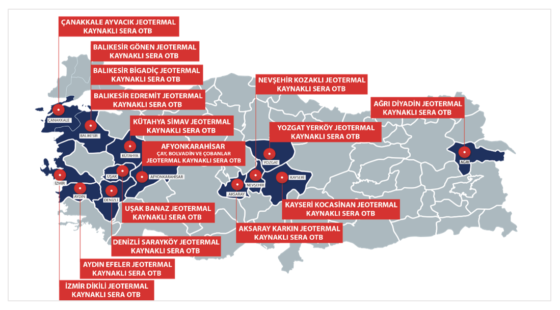 Tüzel kişilik kazanan bitkisel üretim konulu organize tarım bölgelerinden 15 adedi jeotermal kaynaklı sera konuludur: Aydın, Balıkesir (3), Çanakkale, Afyon, Ağrı, Aksaray, Denizli, İzmir, Kayseri, Kütahya, Nevşehir ve Uşak, Yozgat.