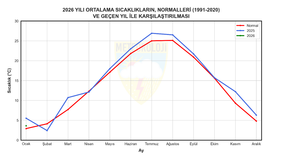 2026 yılı Ocak ayında ortalama sıcaklıklar, Kahramanmaraş, Antakya, İslahiye, Samandağ, Tunceli, Malatya, Arapgir, Çemişgezek, Palu, Baskil, Ergani, Doğanşehir, Siirt, Gaziantep, Kilis, Adıyaman, Şanlıurfa, Diyarbakır, Batman, Çermik, Kahta, Siverek, Viranşehir, Birecik, çevrelerinde mevsim normallerinin altında; Marmara Bölgesi’nin genelinde, Ege Bölgesi’nin kıyı kesimlerinde, Eğirdir, Köyceğiz, Fethiye, Isparta, Kale(Demre), Eskişehir, Cihanbeyli, Sinop, Samsun, Ordu, Giresun, Trabzon, Hopa, Düzce, Cide, Ünye, Pazar (Rize) çevrelerinde mevsim normallerinin üzerinde gerçekleşirken, yurdumuzun diğer bölgelerinde mevsim normalleri civarında gerçekleşmiştir.