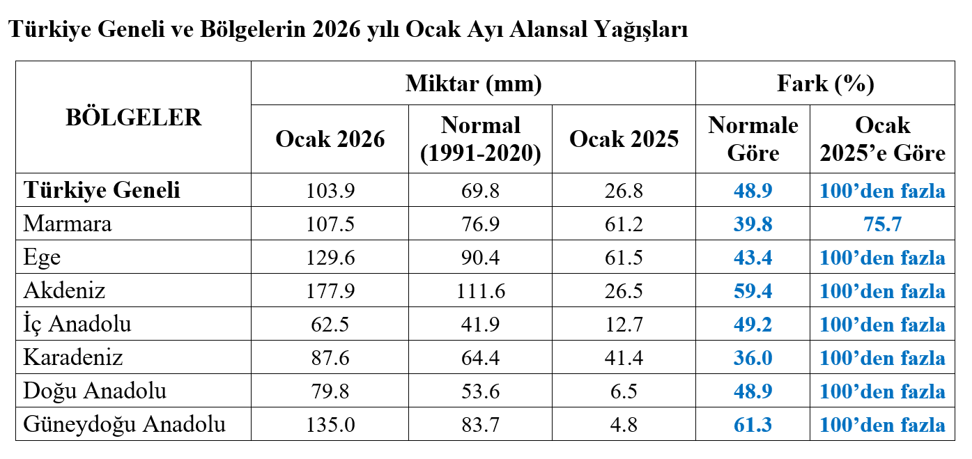 Türkiye genelinde ocak ayında ortalama 103.9 mm yağış kaydedilmiştir. Ocak ayı normali 69.8 mm (1991-2020) ve geçen yıl ocak ayı yağışı 26.8 mm’dir. Ocak ayında Türkiye geneli yağışlarda, normaline göre %49 artış gerçekleşirken, geçen yıl ocak ayı yağışlarının 3 katından fazla artış kaydedilmiştir.