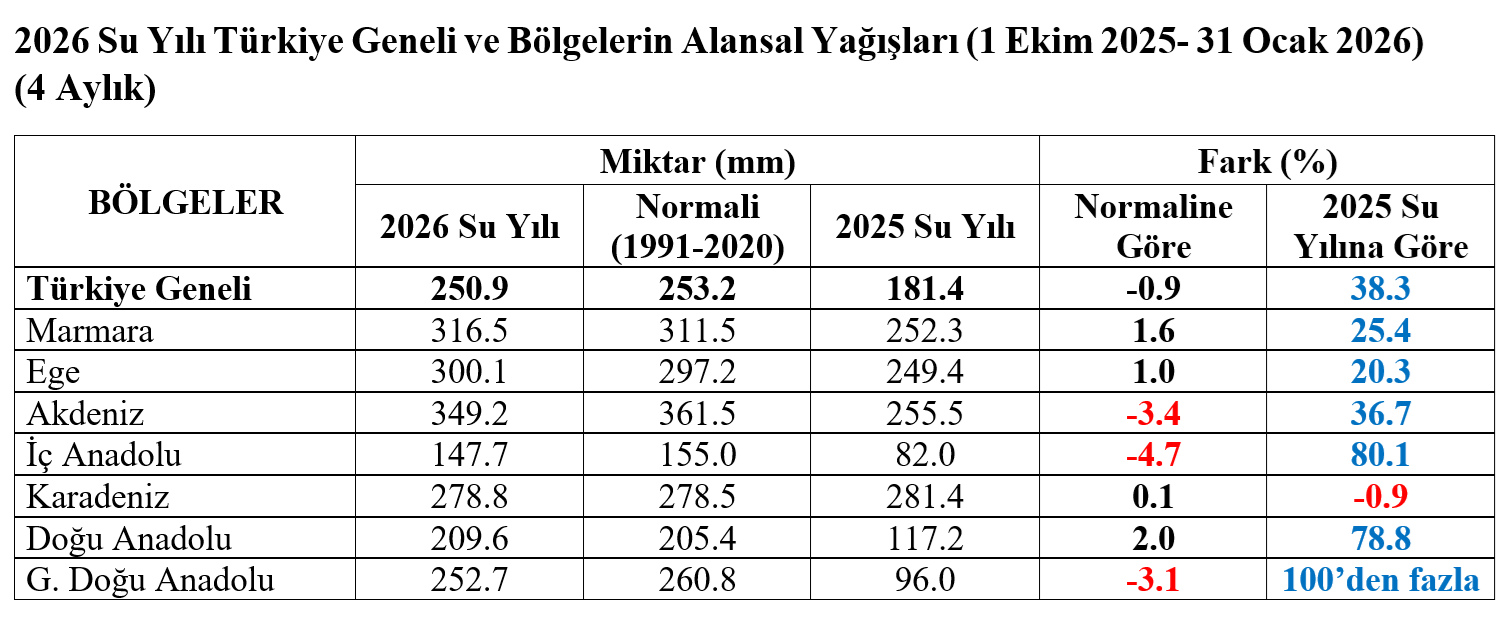 1 Ekim 2025-31 Ocak 2026 dönemini kapsayan 4 aylık 2026 su yılı yağışları Türkiye genelinde yağışlar normallerine yakın (-%0,9), ancak 2025 su yılına göre %38 artış göstermiştir. Çoğu bölgede normaller civarında seyir görülürken, özellikle İç, Doğu ve Güneydoğu Anadolu’da geçen yıla göre belirgin toparlanma dikkat çekmektedir.