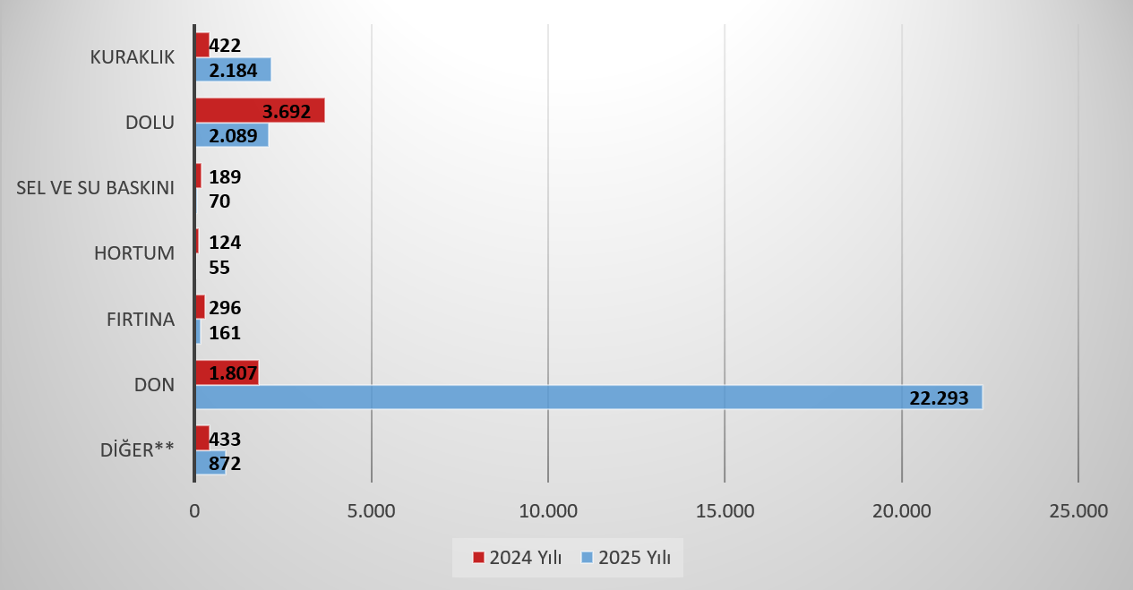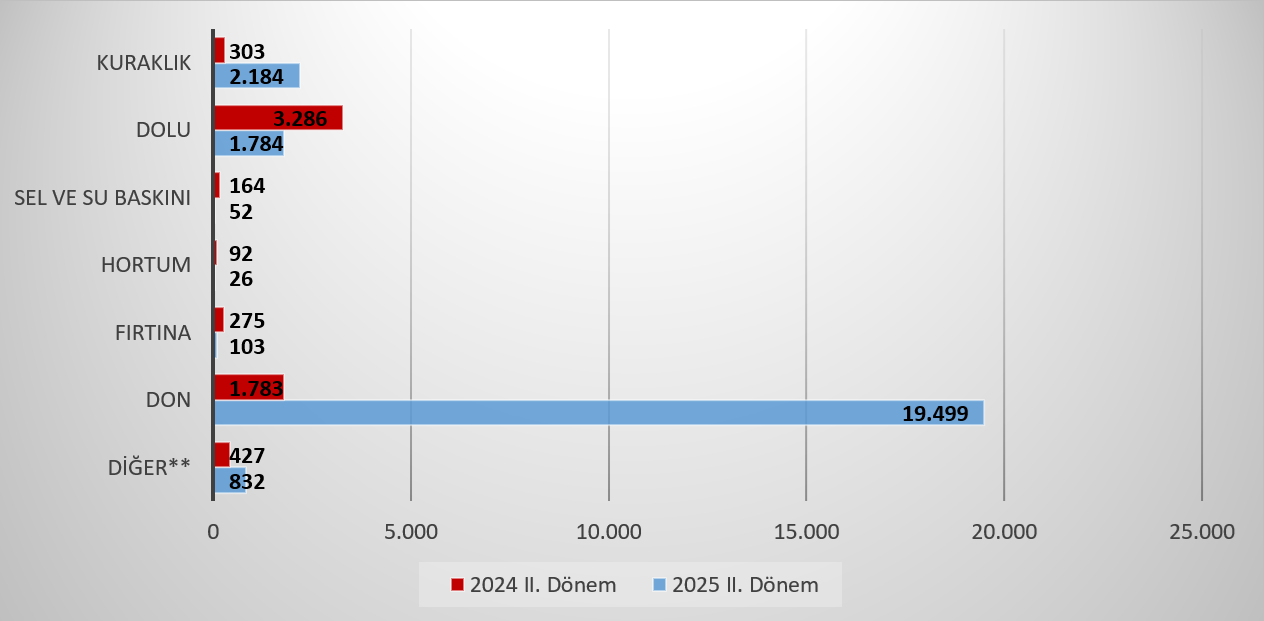2025 yılının II. döneminde bir önceki yılın aynı dönemine göre bitkisel ürün sigortasında sigortalanan alan %30,6, küçükbaş hayvan hayat sigortasında hayvan sayısı %,37,5, büyükbaş hayvan hayat sigortasında hayvan sayısı %,25,8 oranında bir artış olmuştur.